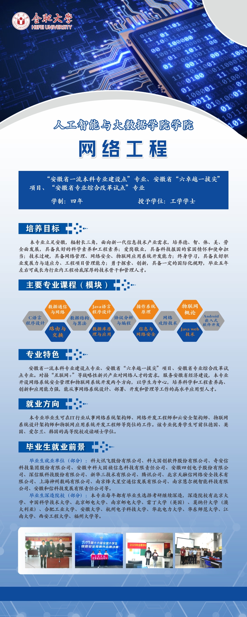 培養(yǎng)目標(biāo)及特色:本專(zhuān)業(yè)立足安徽,輻射長(zhǎng)三角,面向新一代信息產(chǎn)業(yè)發(fā)展需求,培養(yǎng)德、智、體、美、勞全面發(fā)展,具備良好的科學(xué)素養(yǎng)和工程素養(yǎng),具有網(wǎng)絡(luò)基礎(chǔ)、網(wǎng)絡(luò)協(xié)議、網(wǎng)絡(luò)管理和網(wǎng)絡(luò)安全等方面扎實(shí)的理論基礎(chǔ),并通過(guò)提出問(wèn)題、分析問(wèn)題、自主學(xué)習(xí)來(lái)解決復(fù)雜網(wǎng)絡(luò)工程問(wèn)題,能夠從事計(jì)算機(jī)網(wǎng)絡(luò)系統(tǒng)的分析、設(shè)計(jì)、集成、開(kāi)發(fā)、測(cè)試、運(yùn)行維護(hù)和管理的高素質(zhì)工程應(yīng)用型人才。