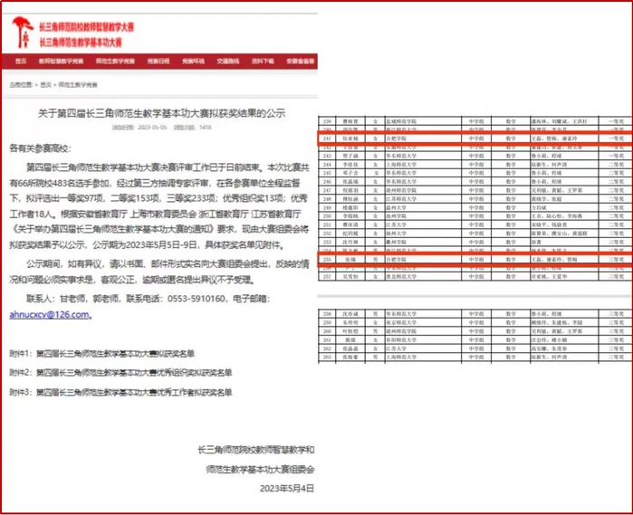 5月6日,由安徽省教育廳、上海市教育委員會、浙江省教育廳、江蘇省教育廳主辦的第四屆長三角師范生教學基本功大賽決賽擬獲獎名單公示。我校20級數學與應用數學專業伍亞楠和張瑞同學在與來自華東師范大學、浙江師范大學的優秀學子的同場競技中發揮出色,分獲一等獎和三等獎。據悉,在此前進行的安徽省師范生教學技能競賽中,伍亞楠和張瑞雙雙獲得一等獎并入選中學數學組“省隊”,代表安徽省參加了此次長三角師范生教學基本功大賽。此外,在4月16日進行的“田家炳杯”第八屆全國師范院校師范生教學技能競賽決賽中,20級數學與應用數學專業吳倩同學獲得二等獎,這是數學與應用數學(師范)專業連續三年進入決賽并獲得二等獎。