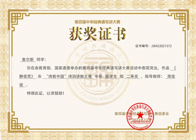 博大精深的中華文明是中華民族獨特的精神標識,詩教是中華文明的重要內容,它承載著中華民族的歷史、文化和價值理念,潤物無聲,成風化人。近日,由教育部、國家語委舉辦的第四屆中華經典誦寫講大賽“詩教中國”詩詞講解大賽評選結果揭曉。通過初賽、復賽、決賽、總決賽等環節的激烈角逐和綜合比拼,語言文化與傳媒學院周佳俊老師指導的來華留學生查爾斯以其優異表現榮獲全國賽二等獎。